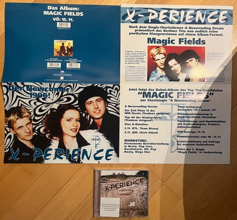 - + 3 original Werbeflyer klein (A6) aufklappbar (1. Auftritt in Kai Discothek Magdeburg, 2. Auftritt Tiffany Discothek, 3. aus der Weihnachtswerbekampagen der Warner für das Magic Fields Album)